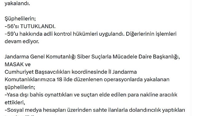 İÇİŞLERİ Bakanlığı, 18 ilde 'Nitelikli dolandırıcılık ve yasa dışı bahis' suçlarına yönelik düzenlenen operasyonlarda yakalanan 127 şüpheliden 56'sının tutuklandığını duyurdu.Bakanlığın sanal medya hesabından yapılan yazılı açıklamada, "18 il merkezli 'nitelikli dolandırıcılık ve yasa dışı bahis' suçlarına yönelik jandarmamız tarafından düzenlenen operasyonlarda 127 şüpheli yakalandı. Şüphelilerin 56'sı tutuklandı, 59'u hakkında adli kontrol hükümleri uygulandı. Diğerlerinin işlemleri devam ediyor" denildi. 'SAHTE İLANLARLA DOLANDIRICILIK YAPTIKLARI TESPİT EDİLDİ'Operasyonun Jandarma Genel Komutanlığı Siber Suçlarla Mücadele Daire Başkanlığı, Mali Suçları Araştırma Kurulu (MASAK) ve Cumhuriyet Başsavcılıkları koordinesinde gerçekleştirildiği kaydedilerek, "Yakalanan şüphelilerin; yasa dışı bahis oynattıkları ve suçtan elde edilen para nakline aracılık ettikleri, sosyal medya hesapları üzerinden sahte ilanlarla dolandırıcılık yaptıkları tespit edildi. Bilişim sistemleri ve sosyal medya üzerinden nitelikli dolandırıcılık yapan suç şebekelerine yönelik Siber Vatanımızda kararlılıkla mücadele etmeye devam ediyoruz. Daire Başkanlığımızı, kahraman jandarmamızı, MASAK'ımızı, Cumhuriyet Başsavcılıklarımızı ve emeği geçenleri tebrik ediyoruz" ifadelerine yer verildi.