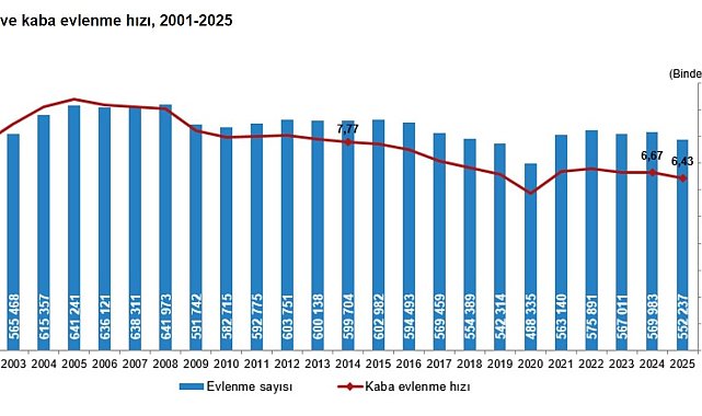 TÜRKİYE'de 2025 yılında evlenen çiftlerin sayısı 552 bin 237, boşanan çiftlerin sayısı ise 193 bin 793 oldu.Türkiye İstatistik Kurumu (TÜİK), 2025 yılına ilişkin evlenme ve boşanma istatistiklerini açıkladı. Buna göre; evlenen çiftlerin sayısı 2024 yılında 569 bin 983 iken 2025 yılında 552 bin 237 oldu. Bin nüfus başına düşen evlenme sayısını ifade eden kaba evlenme hızı 2025 yılında binde 6,43 olarak gerçekleşti. Boşanan çiftlerin sayısı 2024 yılında 188 bin 963 iken 2025 yılında 193 bin 793 oldu. Bin nüfus başına düşen boşanma sayısını ifade eden kaba boşanma hızı 2025 yılında binde 2,26 olarak gerçekleşti.ORTALAMA İLK EVLENME YAŞI YÜKSELDİYıllara göre ortalama ilk evlenme yaşı incelendiğinde, her iki cinsiyette de ilk evlenme yaşının arttığı görüldü. Ortalama ilk evlenme yaşı 2025 yılında erkeklerde 28,5 iken kadınlarda 26 oldu. Erkek ile kadın arasındaki ortalama ilk evlenme yaş farkı ise 2,5 yaş olarak gerçekleşti.KABA EVLENME HIZININ EN YÜKSEK OLDUĞU İL GAZİANTEPKaba evlenme hızının 2025 yılında en yüksek olduğu il, binde 7,76 ile Gaziantep oldu. Bu ili binde 7,68 ile Osmaniye, binde 7,50 ile Şanlıurfa izledi. Kaba evlenme hızının en düşük olduğu il ise binde 4,18 ile Tunceli oldu. Bu ili binde 4,58 ile Gümüşhane, binde 4,67 ile Ardahan izledi.YABANCI DAMATLARIN SAYISI 5 BİN, GELİNLERİN SAYISI 28 BİN OLDUToplam evlenmeler içinde yabancı kişiler ile evlenmeler incelendiğinde, yabancı damatların sayısı 2025 yılında 5 bin 347 olup toplam damatların yüzde 1'ini oluştururken, yabancı gelinlerin sayısı 28 bin 646 olup toplam gelinlerin yüzde 5,2'sini oluşturdu. Yabancı damatlar uyruklarına göre incelendiğinde, yabancı damatlar içinde yüzde 20,9 ile Suriyeli damatlar birinci sırada yer aldı. Suriyeli damatları yüzde 18,8 ile Alman damatlar ve yüzde 5 ile Afgan damatlar izledi. Yabancı gelinler uyruklarına göre incelendiğinde, yabancı gelinler içinde yüzde 13,8 ile Suriyeli gelinler birinci sırada yer aldı. Bu gelinleri yüzde 13,7 ile Özbek gelinler ve yüzde 9,6 ile Faslı gelinler izledi.BOŞANMA HIZININ EN YÜKSEK OLDUĞU İL İZMİRKaba boşanma hızının 2025 yılında en yüksek olduğu il, binde 3,28 ile İzmir oldu. Bu ili binde 3,21 ile Antalya, binde 3,14 ile Denizli izledi. Kaba boşanma hızının en düşük olduğu il ise binde 0,51 ile Hakkari oldu. Bu ili binde 0,52 ile Şırnak, binde 0,63 ile Bitlis izledi. Evlilik süresine göre boşanmalar incelendiğinde, 2025 yılında gerçekleşen boşanmaların yüzde 34'ü evliliğin ilk 5 yılı, yüzde 20,3'ü ise evliliğin 6-10 yılı içinde gerçekleşti.Kesinleşen boşanma davaları sonucunda 2025 yılında 193 bin 793 çift boşanırken 191 bin 371 çocuk velayete verildi. Boşanma davaları sonucu, çocukların velayetinin çoğunlukla anneye verildiği görüldü. Çocukların velayetinin 2025 yılında yüzde 74,6'sı anneye, yüzde 25,4'ü babaya verildi.