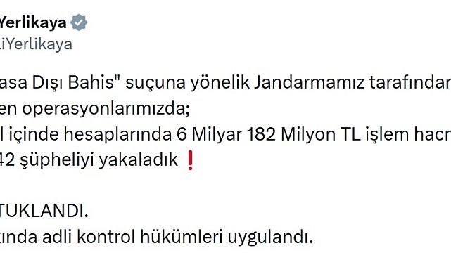 İÇİŞLERİ Bakanı Ali Yerlikaya, 23 ilde 'Yasa dışı bahis' suçuna yönelik düzenlenen operasyonlarda yakalanan 42 kişiden 27'sinin tutuklandığını duyurdu.İçişleri Bakanı Ali Yerlikaya, 23 ilde jandarma tarafından düzenlenen operasyonları sosyal medya hesabından paylaştı. Buna göre; şüphelilerin internet siteleri üzerinden yasa dışı bahis oynattıkları ve yasa dışı para transferlerine aracılık ettikleri, elde ettikleri yasa dışı geliri üçüncü kişiler tarafından açılan kripto para hesaplarıyla uluslararası hesaplara transfer ederek akladıkları, yasa dışı bahis oynayan kişilerden komisyon aldıkları tespit edildi. Düzenlenen operasyonlarda son 1,5 yıl içinde hesaplarında 6 milyar 182 milyon TL işlem hacmi bulunan 42 şüpheli yakalandı. Şüphelilerden 27'si tutuklandı, 15'i hakkında adli kontrol hükümleri uygulandı. Şüphelilere ait yaklaşık 203 milyon TL değerinde; 25 ev/arsa ve 25 araç ile 428 banka, 35 adet kripto hesabına el konuldu.