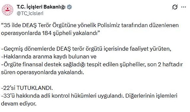 İÇİŞLERİ Bakanlığı, son 2 haftada 35 ilde DEAŞ terör örgütüne yönelik düzenlenen operasyonlarda yakalanan 184 şüpheliden 22'sinin tutuklandığını duyurdu.Bakanlığın sanal medya hesabından yapılan açıklamaya göre; son 2 haftada polis tarafından 35 ilde DEAŞ'e yönelik operasyonlar düzenlendi ve 184 şüpheli gözaltına alındı. Şüphelilerin, geçmiş dönemlerde DEAŞ terör örgütü içerisinde faaliyet yürüttükleri, haklarında aranma kaydı bulunduğu ve örgüte finansal destek sağladığı tespit edildi. Şüphelilerden 22'si tutuklandı. 33'ü hakkında adli kontrol hükümleri uygulandı. Diğerlerinin işlemleri devam ediyor. Operasyonlarda; 8 adet ruhsatsız tabanca, 1 adet ruhsatsız tüfek ile çok sayıda örgütsel doküman ve dijital materyal ele geçirildi.
