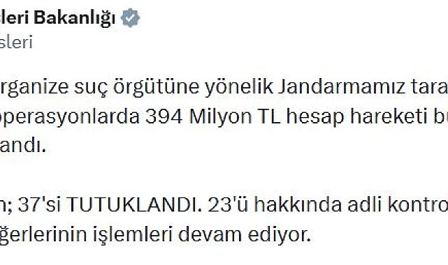 İÇİŞLERİ Bakanlığı, 5 ilde 6 ayrı organize suç örgütüne yönelik düzenlenen operasyonlarda gözaltına alınan 65 şüpheliden 37'sinin tutuklandığını duyurdu.Bakanlığın sanal medya hesabından yapılan açıklamaya göre; jandarma ekipleri, 5 ilde 6 ayrı organize suç örgütüne yönelik operasyon düzenledi. Operasyonlarda, 394 milyon TL hesap hareketi bulunan 65 şüpheli yakalandı. Şüphelilerin adreslerinde çok sayıda dijital materyal, muhtelif miktarda nakit para ve doküman ele geçirildi. Adliyeye sevk edilen şüphelilerden 37'si tutuklandı, 23'ü hakkında adli kontrol hükümleri uygulandı. Diğerlerinin işlemleri ise devam ediyor.Yakalanan şüphelilerin; Aydın'da; sosyal medya hesapları üzerinden ilan vererek ve yüz yüze görüşmeler yaparak tarım ürünü aldıkları ancak ödemesini yapmadıkları, Kocaeli'de; şiddet ve baskı ile vatandaşları mal varlıklarını devretmeye zorladıkları, Konya'da; sahte siteler üzerinden vatandaşlara ait kişisel bilgileri yasa dışı yollar ile ele geçirdikleri, ayrıca kendilerini avukat olarak tanıtarak para talep edip vatandaşları dolandırdıkları, Antalya ve Zonguldak'ta; internet siteleri üzerinden 'yatırım' vaadiyle dolandırıcılık suçunu organize şekilde işledikleri tespit edildi.