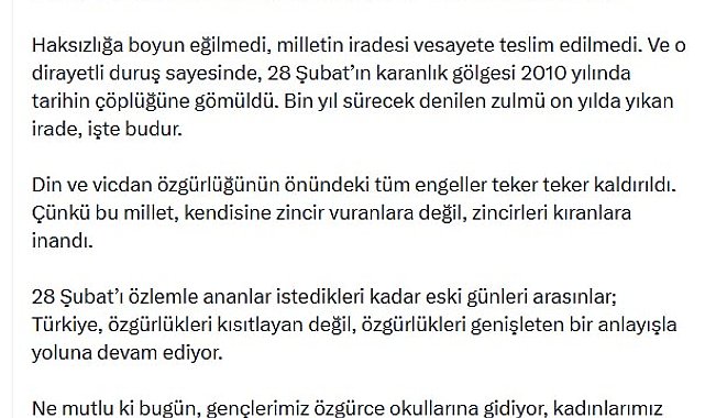 ANKARA, (DHA)- AK Parti Genel Başkan Vekili Efkan Ala, "Türkiye'nin siyasi tarihine kara bir leke olarak geçen 28 Şubat süreci, milletin iradesine pranga vurmayı hedefleyen vesayet odaklarının en acımasız dönemlerinden biriydi" dedi
