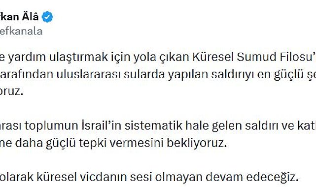 AK Parti Genel Başkan Vekili Efkan Ala, "Uluslararası toplumun İsrail'in sistematik hale gelen saldırı ve katliam siyasetine daha güçlü tepki vermesini bekliyoruz" dedi.AK Parti Genel Başkan Vekili Efkan Ala, sanal medya hesabından yaptığı açıklamada, "Gazze'ye yardım ulaştırmak için yola çıkan Küresel Sumud Filosu'na İsrail güçleri tarafından uluslararası sularda yapılan saldırıyı en güçlü şekilde lanetliyoruz. Uluslararası toplumun İsrail'in sistematik hale gelen saldırı ve katliam siyasetine daha güçlü tepki vermesini bekliyoruz. Türkiye olarak küresel vicdanın sesi olmayan devam edeceğiz" dedi.