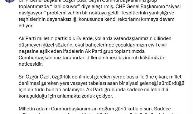 AK Parti Genel Başkan Yardımcısı ve Parti Sözcüsü Ömer Çelik, "CHP Genel Başkanı'nın 'siyasi navigasyon' problemi vahim bir noktaya geldi" dedi. AK Parti Sözcüsü Çelik, sanal medya hesabından yaptığı açıklamada, "CHP Genel Başkanı Özgür Özel, Sayın Cumhurbaşkanımızı grup toplantımızda 'ilahi okuyor' diye eleştirmiş. CHP Genel Başkanı'nın 'siyasi navigasyon' problemi vahim bir noktaya geldi. Tespitlerinin yanlışlığı ve teşhislerinin dayanaksızlığı konusunda kendi rekorlarını kırmaya devam ediyor. Ak Parti milletin partisidir. Evlerde, yollarda vatandaşlarımızın dilinden düşmeyen güzel sözlerin, okul bahçelerinde çocuklarımızın cıvıl cıvıl neşesine eşlik eden ifadelerin Ak Parti grup toplantımızda Cumhurbaşkanımız tarafından dillendirilmesi bizim ruh kökümüzün neticesidir. Sayın Özgür Özel, 'özgürlük' denilmesi gereken yerde baskı ile öne çıkan, 'millet' denilmesi gereken yere vesayet tabelası asan bir siyasi geleneği sürdürdüğü için bir türlü bunları anlamıyor. Ak Parti grubunda sadece milletin dili konuşulduğu için anlamakta zorluk çekiyor. Milletin adamı Cumhurbaşkanımızın doğum günü kutlu olsun. Sadece millete adanmış ve sadece milletin dilini konuşan yürüyüşünün daha nice bereketli yılları olsun" dedi.