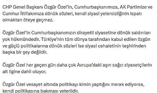 AK Parti Genel Başkan Yardımcısı ve Parti Sözcüsü Ömer Çelik, "CHP Genel Başkanı Özgür Özel'in, Cumhurbaşkanımıza, AK Parti'mize ve Cumhur İttifakı'mıza dönük sözleri, kendi siyasi yetersizliğinin ispatı olmaktan öteye geçmez. Özgür Özel'in Cumhurbaşkanımızın dirayetli siyasetine dönük saldırıları yok hükmündedir" dedi.AK Parti'li Çelik, sanal medya hesabından yaptığı açıklamada, "CHP Genel Başkanı Özgür Özel'in, Cumhurbaşkanımıza, AK Parti'mize ve Cumhur İttifakı'mıza dönük sözleri, kendi siyasi yetersizliğinin ispatı olmaktan öteye geçmez. Özgür Özel'in Cumhurbaşkanımızın dirayetli siyasetine dönük saldırıları yok hükmündedir. Türkiye'nin tüm dünya tarafından kabul edilen özgün ve güçlü politikalarına dönük sözleri ise siyasi cehaletinin teşhirinden başka bir şey değildir. Özgür Özel her geçen gün daha çok Avrupa'daki aşırı sağcı siyasetçilerin alt ligine dahil oluyor. Özgür Özel vesayet altında politikayı kimin yaptığını merak ediyorsa, kendi politikasına bakması yeterlidir" ifadelerini kullandı.
