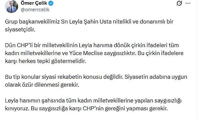 AK Parti Sözcüsü Ömer Çelik, TBMM Genel Kurulu'nda AK Parti Grup Başkanvekili Leyla Şahin Usta ile CHP milletvekilleri arasındaki tartışmaya ilişkin, "Dün CHP'li bir milletvekilinin Leyla hanıma dönük çirkin ifadeleri tüm kadın milletvekillerine ve Yüce Meclise saygısızlıktır" dedi.AK Parti'li Ömer Çelik, sosyal medya hesabından yaptığı açıklamada, "Grup başkanvekilimiz Sayın Leyla Şahin Usta nitelikli ve donanımlı bir siyasetçidir. Dün CHP'li bir milletvekilinin Leyla hanıma dönük çirkin ifadeleri tüm kadın milletvekillerine ve Yüce Meclise saygısızlıktır. Bu çirkin ifadelere karşı herkes tepki göstermelidir. Bu tip konular siyasi rekabetin konusu değildir. Siyasetin adabına uygun olarak özür dilenmesi gerekir. Leyla hanımın şahsında tüm kadın milletvekillerine yapılan saygısızlığı kınıyoruz. Bu saygısızlığa karşı CHP'nin gereğini yapması gerekir" dedi.