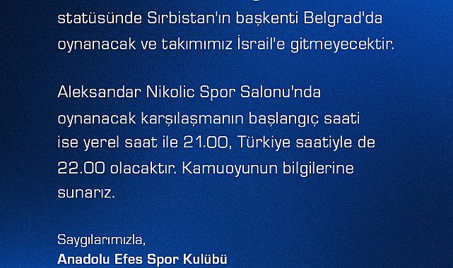 - ANADOLU Efes Spor Kulübü, EuroLeague'in 35'inci haftasında 1 Nisan 2026 Çarşamba günü deplasmanda Maccabi Rapyd Tel Aviv ile oynanacak karşılaşmanın statüsünde değişiklik yapıldığını açıkladı.Kulüpten yapılan açıklamada, "EuroLeague'in 35'inci haftasında, 1 Nisan 2026 Çarşamba günü Maccabi Rapyd Tel Aviv ile deplasmanda oynayacağımız karşılaşma; 2 Nisan 2026 Perşembe günü, tarafsız saha statüsünde Sırbistan'ın başkenti Belgrad'da oynanacak ve takımımız İsrail'e gitmeyecektir. Aleksandar Nikolic Spor Salonu'nda oynanacak karşılaşmanın başlangıç saati ise yerel saat ile 21.00, Türkiye saatiyle de 22.00 olacaktır. Kamuoyunun bilgilerine sunarız" ifadelerine yer verildi. (FOTOĞRAFLI)