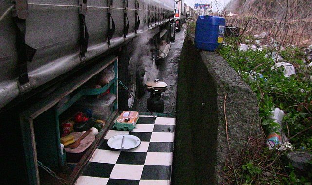 TÜRKİYE'nin Kafkas ülkelerine açılan Artvin'in Sarp Sınır Kapısı'ndan Gürcistan'a geçebilmek için TIR kuyruğunda sıra bekleyen şoförler, yol kenarında kurdukları iftar sofrasında oruçlarını açtı.Türkiye'nin Kafkas ülkelerine açılan en önemli kapısı olan Artvin'deki Sarp Sınır Kapısı'nda, Gürcistan'a geçmek için bekleyen TIR şoförleri, ramazanda oruçlarını, yol kenarında kurdukları iftar sofralarında açıyor. Kafkaslar ve Orta Asya'ya yönelik ihracat ve ithalat işlemlerinin devam ettiği sınır kapısındaki yoğunluğun, şoförlere zaman zaman zor anlar yaşattığı belirtiliyor. Ramazan ayında sınırı geçmek için kilometrelerce uzayan kuyrukta bekleyen şoförler, ezan saati geldiğinde hazırlıklarını yol kenarında yapıyor. Sürücülerin bir kısmı trafik akışını kaçırmamak adına orucunu direksiyon başında açtı, bazıları dapark halindeki araçlarının yanındaki sofralarında oruç açtı.