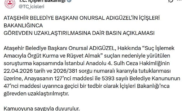 İÇİŞLERİ Bakanlığı, hakkında yürütülen soruşturma kapsamında tutuklanan Ataşehir Belediye Başkanı Onursal Adıgüzel'in geçici tedbir olarak görevden uzaklaştırıldığını açıkladı.Bakanlığın sanal medya hesabından yapılan açıklamada, "Ataşehir Belediye Başkanı Onursal Adıgüzel, hakkında 'Suç İşlemek Amacıyla Örgüt Kurma ve Rüşvet Almak' suçları nedeniyle yürütülen soruşturma kapsamında İstanbul Anadolu 4'üncü Sulh Ceza Hakimliğinin 22.04.2026 tarih ve 2026/381 sorgu numaralı kararıyla tutuklanması üzerine, Anayasanın 127'nci maddesi ile 5393 sayılı Belediye Kanununun 47'nci maddesi uyarınca geçici bir tedbir olarak İçişleri Bakanlığı'nca görevden uzaklaştırılmıştır" denildi.