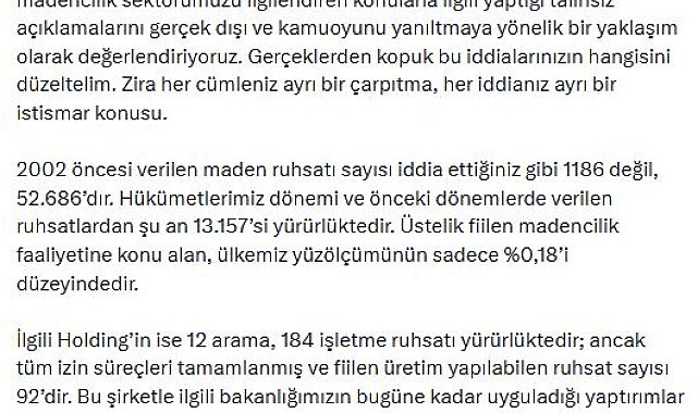 ANKARA, (DHA)- ENERJİ ve Tabii Kaynaklar Bakanı Alparslan Bayraktar, CHP Genel Başkanı Özgür Özel'in madencilik sektörüne ilişkin açıklamalarına yanıt verdi
