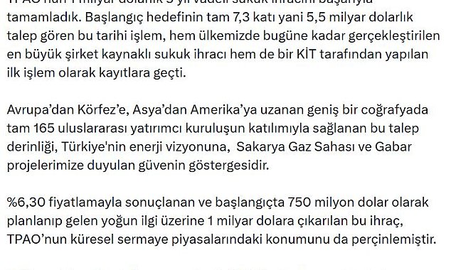 ENERJİ ve Tabii Kaynaklar Bakanı Alparslan Bayraktar, Türkiye Petrolleri Anonim Ortaklığının (TPAO) 1 milyar dolarlık 5 yıl vadeli sukuk ihracını başarıyla tamamladığını duyurdu.Bakan Bayraktar, sanal medya hesabından yaptığı açıklamada, "TPAO'nun 1 milyar dolarlık 5 yıl vadeli sukuk ihracını başarıyla tamamladık. Başlangıç hedefinin tam 7,3 katı yani 5,5 milyar dolarlık talep gören bu tarihi işlem, hem ülkemizde bugüne kadar gerçekleştirilen en büyük şirket kaynaklı sukuk ihracı hem de bir KİT tarafından yapılan ilk işlem olarak kayıtlara geçti. Avrupa'dan Körfez'e, Asya'dan Amerika'ya uzanan geniş bir coğrafyada tam 165 uluslararası yatırımcı kuruluşun katılımıyla sağlanan bu talep derinliği, Türkiye'nin enerji vizyonuna, Sakarya Gaz Sahası ve Gabar projelerimize duyulan güvenin göstergesidir. Yüzde 6,30 fiyatlamayla sonuçlanan ve başlangıçta 750 milyon dolar olarak planlanıp gelen yoğun ilgi üzerine 1 milyar dolara çıkarılan bu ihraç, TPAO'nun küresel sermaye piyasalarındaki konumunu da perçinlemiştir. Milli enerji hamlemiz kapsamında yürüttüğümüz dev projelerimize alternatif finansman kaynakları oluşturarak ülkemizin değerine değer katmaya devam edeceğiz" dedi.
