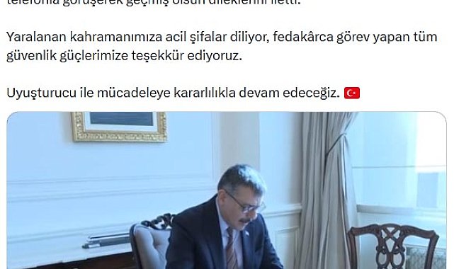 İÇİŞLERİ Bakanı Mustafa Çiftçi, İstanbul Eyüpsultan'da uyuşturucu madde ticaretinin önlenmesine yönelik operasyonda yaralanan uzman çavuşu telefonla arayarak, geçmiş olsun dileğinde bulundu.Bakan Çitfçi, Eyüpsultan'da düzenlenen uyuşturucu operasyonunda yaralanan uzman çavuş ile telefonda görüştü. Bakanlığın sanal medya hesabından paylaşılan görüşmeye ilişkin, "İçişleri Bakanımız Sayın Mustafa Çiftçi, İstanbul Eyüpsultan'da uyuşturucu madde ticaretinin önlenmesine yönelik düzenlenen operasyonda yaralanan kahraman Jandarma Uzman Çavuşumuz ile telefonla görüşerek geçmiş olsun dileklerini iletti. Yaralanan kahramanımıza acil şifalar diliyor, fedakarca görev yapan tüm güvenlik güçlerimize teşekkür ediyoruz. Uyuşturucu ile mücadeleye kararlılıkla devam edeceğiz" açıklaması yapıldı.