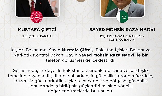 İÇİŞLERİ Bakanı Mustafa Çiftçi, Pakistan İçişleri Bakanı ve Narkotik Kontrol Bakanı Sayed Mohsin Raza Naqvi ile telefonda görüştü.Bakanlığın sanal medya hesabından yapılan açıklamada, "İçişleri Bakanımız Mustafa Çiftçi, Pakistan İçişleri Bakanı ve Narkotik Kontrol Bakanı Sayın Sayed Mohsin Raza Naqvi ile bir telefon görüşmesi gerçekleştirdi. Görüşmede; Türkiye ile Pakistan arasındaki dostane ve kardeşlik temeline dayanan ilişkiler ele alınırken, iç güvenlik, terörle mücadele, düzensiz göç, narkotik suçlarla mücadele ve bölgesel güvenlik konularında iş birliğinin güçlendirilmesine yönelik değerlendirmelerde bulunuldu. Sayın Bakanımız, Türkiye ile Pakistan arasındaki köklü bağların her alanda daha da ileri taşınmasına büyük önem verdiklerini ifade etti. Türkiye ile Pakistan arasındaki iş birliği, önümüzdeki dönemde de karşılıklı anlayış ve yakın diyalog temelinde sürdürülecektir" denildi.