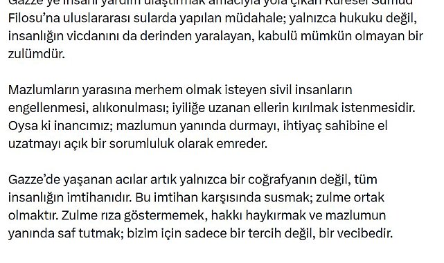 ANKARA, (DHA)- İÇİŞLERİ Bakanı Mustafa Çiftçi, "Gazze'ye insani yardım ulaştırmak amacıyla yola çıkan Küresel Sumud Filosu'na uluslararası sularda yapılan müdahale; yalnızca hukuku değil, insanlığın vicdanını da derinden yaralayan, kabulü mümkün olmayan bir zulümdür" dedi