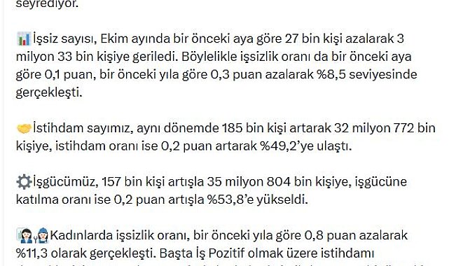 ÇALIŞMA ve Sosyal Güvenlik Bakanı Vedat Işıkhan, "İşsizlikle kararlı mücadelemizin olumlu sonuçları devam ediyor. Orta Vadeli Program ile uyumlu olarak hazırladığımız Ulusal İstihdam Stratejimizin de etkisiyle işsizlik oranı, 30 aydır tekli hanelerde seyrediyor" dedi.Çalışma ve Sosyal Güvenlik Bakanı Vedat Işıkhan, ekim ayı iş gücü istatistiklerine ilişkin sosyal medya hesabından açıklama yaptı. Bakan Işıkhan, "İstihdamımız artıyor, Türkiye güçleniyor. İşsizlikle kararlı mücadelemizin olumlu sonuçları devam ediyor. Orta Vadeli Program ile uyumlu olarak hazırladığımız Ulusal İstihdam Stratejimizin de etkisiyle işsizlik oranı, 30 aydır tekli hanelerde seyrediyor. İşsiz sayısı, ekim ayında bir önceki aya göre 27 bin kişi azalarak 3 milyon 33 bin kişiye geriledi. Böylelikle işsizlik oranı da bir önceki aya göre 0,1 puan, bir önceki yıla göre 0,3 puan azalarak yüzde 8,5 seviyesinde gerçekleşti. İstihdam sayımız, aynı dönemde 185 bin kişi artarak 32 milyon 772 bin kişiye, istihdam oranı ise 0,2 puan artarak yüzde 49,2'ye ulaştı"dedi.'GENÇLERİMİZİN KARİYER ADIMLARINI DESTEKLİYORUZ'İş gücünün, 157 bin kişi artışla 35 milyon 804 bin kişiye, iş gücüne katılma oranının ise 0,2 puan artışla yüzde 53,8'e yükseldiğini kaydeden Işıkhan, "Kadınlarda işsizlik oranı, bir önceki yıla göre 0,8 puan azalarak yüzde 11,3 olarak gerçekleşti. Başta İş Pozitif olmak üzere istihdamı destekleyici programlar sayesinde kadınlarda istihdam oranı bir önceki aya göre 0,6 puan artarak yüzde 32,4, iş gücüne katılma oranı ise 0,7 puan artarak yüzde 36,5 olarak gerçekleşti. Gençlerimizin kariyer adımlarını her zaman destekliyoruz. Gençlerde işsizlik oranı, bir önceki yıla göre 0,8 puan azalarak yüzde 15,6'ya geriledi. Ülkemiz için hayalleri olan gençlerimizin yanında olmaya devam edeceğiz. Özellikle son dönemde yeşil ve dijital dönüşümün çalışma hayatı üzerindeki etkisinin farkındayız. Ülkemizin koşullarına uygun, insanı ve emeği merkeze alan politikalarımızı sürdüreceğiz. Daha güçlü bir istihdam yapısı ve çalışma hayatı için gayretle çalışacağız" açıklamasında bulundu.