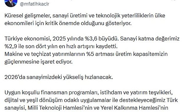 SANAYİ ve Teknoloji Bakanı Mehmet Fatih Kacır, 2025 yılına ilişkin Gayrisafi Yurt İçi Hasıla (GSYH) verilerine dair, "Makine ve teçhizat yatırımlarının yüzde 5 artması üretim kapasitemizin güçlenmesine işaret ediyor. 2026'da sanayimizdeki yükseliş hızlanacak" dedi.Bakan Kacır, sanal medya hesabından yaptığı açıklamada, 2025 yılına ilişkin GSYH verilerini değerlendirdi. Kacır, "Küresel gelişmeler, sanayi üretimi ve teknolojik yeterliliklerin ülke ekonomileri için kritik önemde olduğunu gösteriyor. Türkiye ekonomisi, 2025 yılında yüzde 3,6 büyüdü. Sanayi katma değerimiz yüzde 2,9 ile son dört yılın en hızlı artışını kaydetti. Makine ve teçhizat yatırımlarının yüzde 5 artması üretim kapasitemizin güçlenmesine işaret ediyor. 2026'da sanayimizdeki yükseliş hızlanacak. Uygun koşullu finansman programları, istihdam ve yatırım teşvikleri, dijital ve yeşil dönüşüm odaklı uygulamalar ile destekleyeceğimiz Türk sanayisi, Milli Teknoloji Hamlesi'nin ve Yerel Kalkınma Hamlesi'nin öncüsü olmayı sürdürecek" dedi.