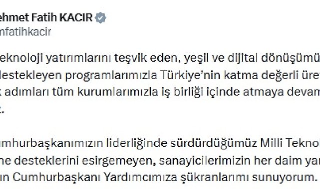 ANKARA, (DHA)- SANAYİ ve Teknoloji Bakanı Mehmet Fatih Kacır, "Yüksek teknoloji yatırımlarını teşvik eden, yeşil ve dijital dönüşümü güçlü şekilde destekleyen programlarımızla Türkiye'nin katma değerli üretimini artıracak adımları tüm kurumlarımızla iş birliği içinde atmaya devam edeceğiz" dedi