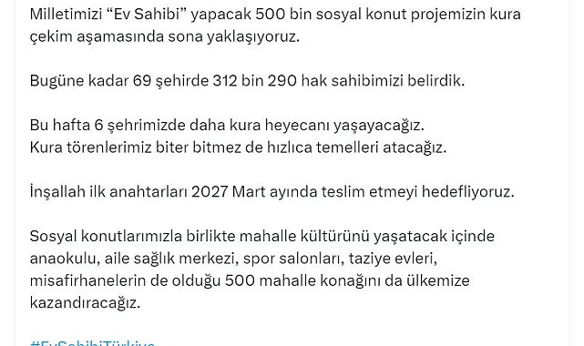 ANKARA, (DHA)- ÇEVRE, Şehircilik ve İklim Değişikliği Bakanı Murat Kurum, Türkiye genelinde 500 bin sosyal konutun inşa edileceği Yüzyılın Konut Projesi'nde 23 Şubat-1 Mart haftasının kura programını paylaştı