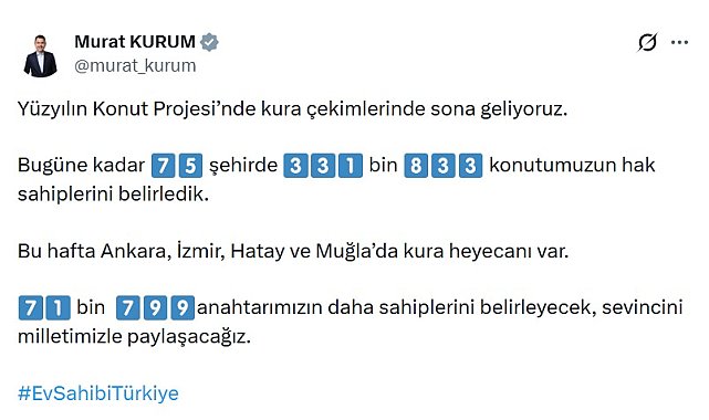 ANKARA, (DHA)- ÇEVRE, Şehircilik ve İklim Değişikliği Bakanı Murat Kurum, "Bu hafta Ankara, İzmir, Hatay ve Muğla'da kura heyecanı var
