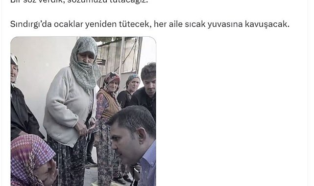 ANKARA, (DHA)- ÇEVRE, Şehircilik ve İklim Değişikliği Bakanı Murat Kurum, Balıkesir'in Sındırgı ilçesinde meydana gelen depremlerin ardından yapımına başlanan ve kaba inşaatları tamamlanan afet konutları ile hak sahibi vatandaşların görüntülerini paylaştı