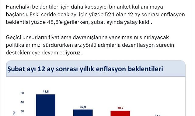 HAZİNE ve Maliye Bakanı Mehmet Şimşek, "Piyasa tahmininin üzerinde gerçekleşen ocak ayı enflasyonuna rağmen, şubatta 12 ay sonrası enflasyon beklentileri bir önceki aya göre reel sektörde 0,9 puan, piyasa katılımcılarında 0,1 puan geriledi" dedi.Bakan Şimşek, sanal medya hesabından yaptığı açıklamada, "Piyasa tahmininin üzerinde gerçekleşen ocak ayı enflasyonuna rağmen, şubatta 12 ay sonrası enflasyon beklentileri bir önceki aya göre reel sektörde 0,9 puan, piyasa katılımcılarında 0,1 puan geriledi. Hanehalkı beklentileri için daha kapsayıcı bir anket kullanılmaya başlandı. Eski seride ocak ayı için yüzde 52,1 olan 12 ay sonrası enflasyon beklentisi yüzde 48,8'e gerilerken, şubat ayında yatay kaldı. Geçici unsurların fiyatlama davranışlarına yansımasını sınırlayacak politikalarımızı sürdürürken arz yönlü adımlarla dezenflasyon sürecini desteklemeye devam ediyoruz" dedi.