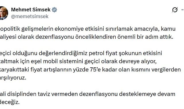 HAZİNE ve Maliye Bakanı Mehmet Şimşek, "Geçici olduğunu değerlendirdiğimiz petrol fiyat şokunun etkisini azaltmak için eşel mobil sistemini geçici olarak devreye alıyor, akaryakıttaki fiyat artışlarının yüzde 75'e kadar olan kısmını vergilerden karşılıyoruz" dedi.Bakan Şimşek, sanal medya hesabından yaptığı açıklamada, "Jeopolitik gelişmelerin ekonomiye etkisini sınırlamak amacıyla, kamu maliyesi olarak dezenflasyonu önceliklendiren önemli bir adım attık. Geçici olduğunu değerlendirdiğimiz petrol fiyat şokunun etkisini azaltmak için eşel mobil sistemini geçici olarak devreye alıyor, akaryakıttaki fiyat artışlarının yüzde 75'e kadar olan kısmını vergilerden karşılıyoruz. Mali disiplinden taviz vermeden dezenflasyonu desteklemeye devam edeceğiz" ifadelerini kullandı.