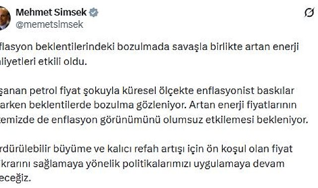 HAZİNE ve Maliye Bakanı Mehmet Şimşek, enflasyon beklentilerinde savaşla birlikte artan enerji maliyetlerinin etkili olduğunu belirterek, "Sürdürülebilir büyüme ve kalıcı refah artışı için ön koşul olan fiyat istikrarını sağlamaya yönelik politikalarımızı uygulamaya devam edeceğiz" dedi.Hazine ve Maliye Bakanı Mehmet Şimşek, sektörel enflasyon beklentilerine ilişkin sanal medya hesabından açıklama yaptı. Bakan Şimşek, "Enflasyon beklentilerindeki bozulmada savaşla birlikte artan enerji maliyetleri etkili oldu. Yaşanan petrol fiyat şokuyla küresel ölçekte enflasyonist baskılar artarken beklentilerde bozulma gözleniyor. Artan enerji fiyatlarının ülkemizde de enflasyon görünümünü olumsuz etkilemesi bekleniyor. Sürdürülebilir büyüme ve kalıcı refah artışı için ön koşul olan fiyat istikrarını sağlamaya yönelik politikalarımızı uygulamaya devam edeceğiz" ifadelerini kullandı.