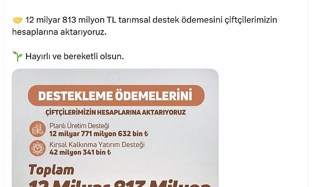 ANKARA, (DHA)- TARIM ve Orman Bakanı İbrahim Yumaklı, "12 milyar 813 milyon TL tarımsal destek ödemesini çiftçilerimizin hesaplarına aktarıyoruz" dedi