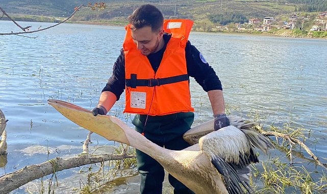 Barajda bitkilerin arasında mahsur kalan yaralı pelikanı itfaiyeciler kurtardı