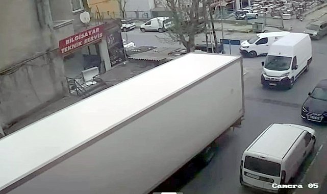 BEYLİKDÜZÜ'nde iddiaya göre şoförün el frenini çekmeyi unuttuğu TIR kayarak arkasındaki kapalı kasa minibüse çarptı. TIR'ın kaydığı ve şoförün aracı durdurmaya çalıştığı anlar güvenlik kamerasına yansıdı.Yakuplu Mahallesi'nde dün öğle saatlerinde iddiaya göre bir TIR şoförü araçtan inerken el frenini çekmeyi unuttu. Araç geriye doğru kaymaya başladı. Şoför, aracın hareketlendiğini görünce koşup, müdahale etmek istedi. Ancak, aracın hızına yetişemedi. TIR'ın dorsesi, arkasındaki kapalı kasa minibüse çarptı. Şans eseri yaralanan kimsenin olmadığı kaza, bir iş yerinin güvenlik kamerasına yansıdı.