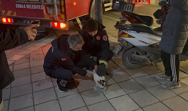 Boş evin balkonunda mahsur kalan kediyi itfaiyeciler kurtardı