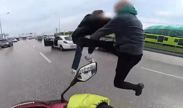 Bursa'da sürücülerin tekmeli-yumruklu kavgası kask kamerasında