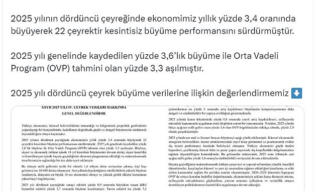 "Nitekim, 2025 yılında bütçe açığının milli gelire oranı yüzde 3,6 olan OVP öngörümüzün oldukça altında, yüzde 2,9 olarak gerçekleşmiştir. 2025 yılında net mal ve hizmet ihracatı büyümeyi aşağı yönlü etkilemiştir. Küresel ekonomide süregelen belirsizlikler, ticaret ortaklarımızdaki zayıf talep görünümü ve jeoekonomik riskler dış ticaret performansı üzerinde belirleyici olmuştur. Türkiye ekonomisi güçlü üretim kapasitesi, çeşitlenmiş ihracat ürün ve pazar yapısı sayesinde dış koşullardaki dalgalanmalara rağmen dayanıklılığını korumaktadır. Bu gelişmeler neticesinde, 2025 sonu itibarıyla cari açığın milli gelire yüzde 1,6 oranıyla sürdürülebilir seviyesini devam ettirmektedir. Hayata geçirdiğimiz makroekonomik istikrar çerçevesi ve yapısal reformlara yönelik öncelikli düzenlemeler, karşılaşılan küresel ve yurt içi sınamalara rağmen etkinliğini kanıtlamış ve elde edilen kazanımlar sağlam bir politika zemini oluşturmuştur. 2026-2028 dönemini kapsayan OVP'de ortaya konulan hedefler doğrultusunda, ekonomimizin şoklara karşı direncini artıran, enflasyonla mücadelemizi güçlendiren, yatırım ortamını iyileştiren ve verimlilik artışını destekleyen politikalarımızı kararlılıkla uygulamaya devam edeceğiz."