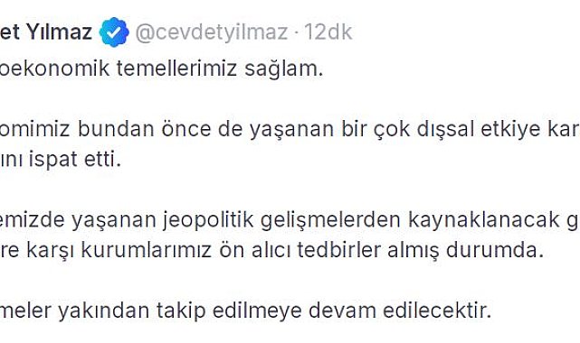 CUMHURBAŞKANI Yardımcısı Cevdet Yılmaz, "Makroekonomik temellerimiz sağlam. Bölgemizde yaşanan jeopolitik gelişmelerden kaynaklanacak geçici etkilere karşı kurumlarımız ön alıcı tedbirler almış durumda" dedi.Cevdet Yılmaz, sanal medya hesabından yaptığı açıklamada, "Makroekonomik temellerimiz sağlam. Ekonomimiz bundan önce de yaşanan birçok dışsal etkiye karşı dirençli yapısını ispat etti. Bölgemizde yaşanan jeopolitik gelişmelerden kaynaklanacak geçici etkilere karşı kurumlarımız ön alıcı tedbirler almış durumda. Gelişmeler yakından takip edilmeye devam edilecektir" dedi.