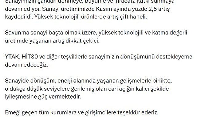 CUMHURBAŞKANI Yardımcısı Cevdet Yılmaz, "Sanayide dönüşüm, enerji alanında yaşanan gelişmelerle birlikte, oldukça düşük seviyelere gerilemiş olan cari açığın kalıcı şekilde iyileşmesine güç vermektedir" dedi.Cumhurbaşkanı Yardımcısı Cevdet Yılmaz, kasım ayı sanayi üretimi istatistiklerine ilişkin sanal medya hesabından açıklama yaptı. Yılmaz, "Sanayimizin çarkları dönmeye, büyüme ve ihracata katkı sunmaya devam ediyor. Sanayi üretimimizde kasım ayında yüzde 2,5 artış kaydedildi. Yüksek teknolojili ürünlerde artış çift haneli. Savunma sanayi başta olmak üzere, yüksek teknolojili ve katma değerli üretimde yaşanan artış dikkat çekici. YTAK, HİT30 ve diğer teşviklerle sanayimizin dönüşümünü destekleyeme devam edeceğiz. Sanayide dönüşüm, enerji alanında yaşanan gelişmelerle birlikte, oldukça düşük seviyelere gerilemiş olan cari açığın kalıcı şekilde iyileşmesine güç vermektedir. Emeği geçen tüm kurumlara ve girişimcilere teşekkür ederiz" dedi.