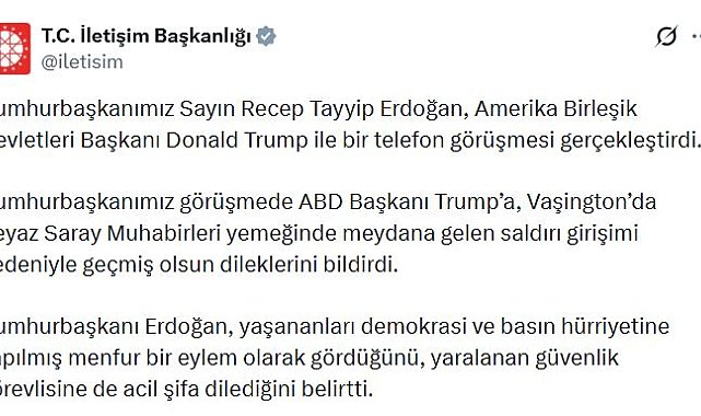 CUMHURBAŞKANI Recep Tayyip Erdoğan, ABD Başkanı Donald Trump ile telefon görüşmesi gerçekleştirdi.İletişim Başkanlığı'ndan yapılan yazılı açıklamada, "Cumhurbaşkanımız Sayın Recep Tayyip Erdoğan, Amerika Birleşik Devletleri Başkanı Donald Trump ile bir telefon görüşmesi gerçekleştirdi. Cumhurbaşkanımız görüşmede ABD Başkanı Trump'a, Vaşington'da Beyaz Saray Muhabirleri yemeğinde meydana gelen saldırı girişimi nedeniyle geçmiş olsun dileklerini bildirdi. Cumhurbaşkanı Erdoğan, yaşananları demokrasi ve basın hürriyetine yapılmış menfur bir eylem olarak gördüğünü, yaralanan güvenlik görevlisine de acil şifa dilediğini belirtti" denildi.