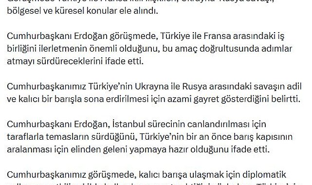 CUMHURBAŞKANI Recep Tayyip Erdoğan, Fransa Cumhurbaşkanı Emmanuel Macron ile karşı tarafın talebi üzerine telefonda görüştü. İletişim Başkanlığından yapılan açıklamaya göre; görüşmede Türkiye ile Fransa ikili ilişkileri, Ukrayna-Rusya savaşı, bölgesel ve küresel konular ele alındı. Cumhurbaşkanı Erdoğan görüşmede, Türkiye ile Fransa arasındaki iş birliğini ilerletmenin önemli olduğunu, bu amaç doğrultusunda adımlar atmayı sürdüreceklerini ifade etti. Erdoğan, Türkiye'nin Ukrayna ile Rusya arasındaki savaşın adil ve kalıcı bir barışla sona erdirilmesi için azami gayret gösterdiğini belirtti. Cumhurbaşkanı Erdoğan, İstanbul sürecinin canlandırılması için taraflarla temasların sürdüğünü, Türkiye'nin bir an önce barış kapısının aralanması için elinden geleni yapmaya hazır olduğunu ifade etti.Cumhurbaşkanı Erdoğan görüşmede, kalıcı barışa ulaşmak için diplomatik yolların en etkili şekilde kullanılmasının gerektiğini söylerken, Türkiye'nin ateşkesin sağlanması sürecindeki ve sonrasındaki çalışmalara desteğinin artarak süreceğini, küresel barışı tehlikeye atacak adımlardan uzak durulmasının barış çabalarına katkı sağlayacağını da belirtti. Görüşmede Kafkaslar, Gazze ve Suriye'deki son durum da ele alındı.