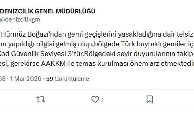 DENİZCİLİK Genel Müdürlüğü'nden, "İran'ın Hürmüz Boğazı'ndan gemi geçişlerini yasakladığına dair telsiz yayınları yapıldığı bilgisi gelmiş olup, bölgede Türk bayraklı gemiler için ISPS Kod Güvenlik Seviyesi 3'tür" açıklaması yapıldı. Denizcilik Genel Müdürlüğü'nün sanal medya hesabından yapılan açıklamada, "İran'ın Hürmüz Boğazı'ndan gemi geçişlerini yasakladığına dair telsiz yayınları yapıldığı bilgisi gelmiş olup, bölgede Türk bayraklı gemiler için ISPS Kod Güvenlik Seviyesi 3'tür. Bölgedeki seyir duyurularının takip edilmesi, gerekirse Araman Kurtarma Koordinsayon Merkezi (AAKKM) ile temas kurulması önem arz etmektedir" denildi.