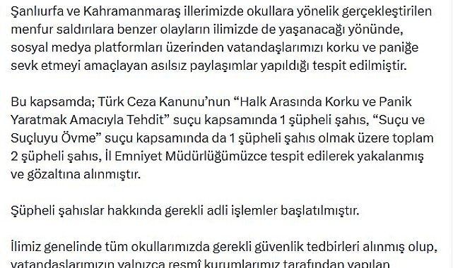 DENİZLİ'de, sanal medya hesaplarından Şanlıurfa ve Kahramanmaraş'taki okul saldırılarına ilişkin halkı yanıltıcı nitelikte paylaşımlar yapan 2 şüpheli gözaltına alındı.Denizli Valiliği'nden yapılan açıklamada, Şanlıurfa ve Kahramanmaraş'da okullara yönelik gerçekleştirilen saldırılara benzer olayların kentte de yaşanacağı yönünde, sanal medya platformları üzerinden vatandaşları korku ve paniğe sevk etmeyi amaçlayan asılsız paylaşımlar yapıldığının tespit edildiği bildirildi.Açıklamada şu ifadelere yer verildi:"Bu kapsamda, Türk Ceza Kanunu'nun 'Halk arasında korku ve panik yaratmak amacıyla tehdit' suçu kapsamında 1 şüpheli şahıs, 'Suçu ve suçluyu övme' suçu kapsamında da 1 şüpheli şahıs olmak üzere toplam 2 şüpheli şahıs, İl Emniyet Müdürlüğümüzce tespit edilerek yakalanmış ve gözaltına alınmıştır. Şüpheli şahıslar hakkında gerekli adli işlemler başlatılmıştır. İlimiz genelinde tüm okullarımızda gerekli güvenlik tedbirleri alınmış olup, vatandaşlarımızın yalnızca resmi kurumlarımız tarafından yapılan açıklamalara itibar etmeleri, doğruluğu teyit edilmemiş paylaşımlara kesinlikle itibar etmemeleri önemle rica olunur."