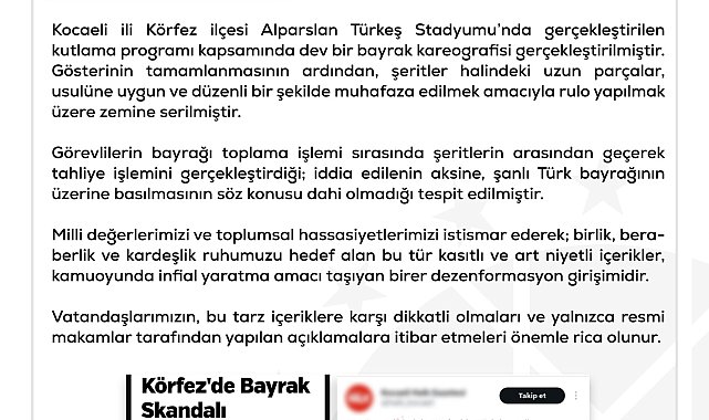 ANKARA, (DHA)- İLETİŞİM Başkanlığı Dezenformasyonla Mücadele Merkezi (DMM), Kocaeli'ndeki 23 Nisan Ulusal Egemenlik ve Çocuk Bayramı programında Türk bayrağına saygısızlık yapıldığı iddialarına ilişkin, "Görevlilerin bayrağı toplama işlemi sırasında şeritlerin arasından geçerek tahliye işlemini gerçekleştirdiği; iddia edilenin aksine, şanlı Türk bayrağının üzerine basılmasının söz konusu dahi olmadığı tespit edilmiştir" açıklaması yaptı