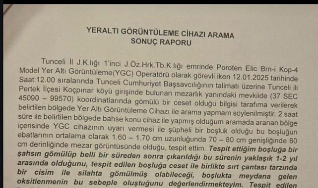 MEZARLIK YANINDAKİ ALANDA KAZI YAPILMIŞTunceli'de, 5 Ocak 2020'den bu yana kayıp olan Gülistan Doku soruşturmasında yer alan ve İl Jandarma Komutanlığı emrinde görevli yer altı görüntüleme operatörü tarafından hazırlanan raporda, Tunceli Cumhuriyet Başsavcılığı'nın talimatıyla 12 Ocak 2025'te Pertek ilçesi Koçpınar köyü girişindeki mezarlık yanında arama yapıldığı belirtildi