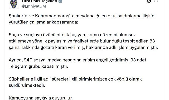 EMNİYET Genel Müdürlüğü (EGM), Şanlıurfa ve Kahramanmaraş'ta meydana gelen okul saldırılarına ilişkin, "Suçu ve suçluyu övücü nitelik taşıyan, kamu düzenini olumsuz etkilemeye yönelik paylaşım ve faaliyetlerde bulunduğu tespit edilen 83 şahıs hakkında gözaltı kararı verilmiş, haklarında adli işlem uygulanmıştır" açıklamasını yaptı.EGM'nin sanal medya hesabından yapılan açıklamada, "Şanlıurfa ve Kahramanmaraş'ta meydana gelen okul saldırılarına ilişkin yürütülen çalışmalar kapsamında; suçu ve suçluyu övücü nitelik taşıyan, kamu düzenini olumsuz etkilemeye yönelik paylaşım ve faaliyetlerde bulunduğu tespit edilen 83 şahıs hakkında gözaltı kararı verilmiş, haklarında adli işlem uygulanmıştır. Ayrıca, 940 sosyal medya hesabına erişim engeli getirilmiş, 93 adet Telegram grubu kapatılmıştır. Şüphelilerle ilgili adli süreçler ilgili birimlerimizce çok yönlü olarak sürdürülmektedir" denildi.
