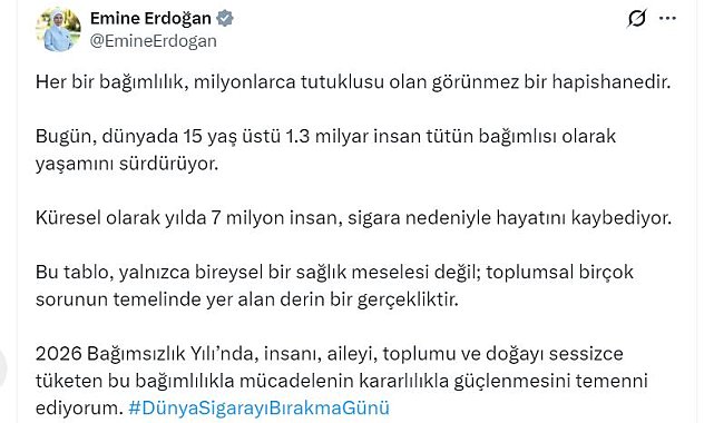 CUMHURBAŞKANI Recep Tayyip Erdoğan'ın eşi Emine Erdoğan, "Küresel olarak yılda 7 milyon insan, sigara nedeniyle hayatını kaybediyor. Bu tablo, yalnızca bireysel bir sağlık meselesi değil; toplumsal birçok sorunun temelinde yer alan derin bir gerçekliktir" dedi.Emine Erdoğan, '9 Şubat Dünya Sigarayı Bırakma Günü' nedeniyle sanal medya hesabından paylaşımda bulundu. Erdoğan, "Her bir bağımlılık, milyonlarca tutuklusu olan görünmez bir hapishanedir. Bugün, dünyada 15 yaş üstü 1,3 milyar insan tütün bağımlısı olarak yaşamını sürdürüyor. Küresel olarak yılda 7 milyon insan, sigara nedeniyle hayatını kaybediyor. Bu tablo, yalnızca bireysel bir sağlık meselesi değil; toplumsal birçok sorunun temelinde yer alan derin bir gerçekliktir. 2026 Bağımsızlık Yılı'nda, insanı, aileyi, toplumu ve doğayı sessizce tüketen bu bağımlılıkla mücadelenin kararlılıkla güçlenmesini temenni ediyorum" dedi.