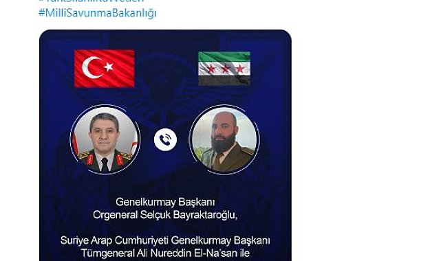 GENELKURMAY Başkanı Orgeneral Selçuk Bayraktaroğlu, Suriye Genelkurmay Başkanı Tümgeneral Ali Nureddin El-Nas'an ile telefonda görüştü.Türk Silahlı Kuvvetleri'nin (TSK) sanal medya hesabından yapılan açıklamada, "Genelkurmay Başkanı Orgeneral Selçuk Bayraktaroğlu, Suriye Arap Cumhuriyeti Genelkurmay Başkanı Tümgeneral Ali Nureddin El-Nas'an ile telefon görüşmesi gerçekleştirdi. Görüşmede, gündeme ilişkin konular değerlendirildi" denildi.