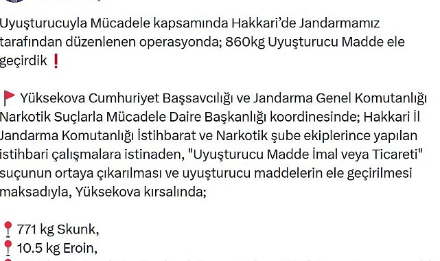 İÇİŞLERİ Bakanı Ali Yerlikaya, Hakkari'de 771 kilo skunk, 10,5 kilo eroin ve 78,5 kilo metamfetamin olmak üzere toplam 860 kilogram uyuşturucu madde ele geçirildiğini duyurdu.Bakan Yerlikaya, jandarma tarafından düzenlenen narkotik operasyonunu sanal medya hesabından duyurdu. Buna göre; Yüksekova Cumhuriyet Başsavcılığı koordinesinde yapılan istihbarı çalışmalar kapsamında düzenlenen operasyonda, Yüksekova kırsalında 771 kilogram skunk, 10,5 kilogram eroin, 78,5 kilogram metamfetamin olmak üzere toplam 860 kilogram uyuşturucu madde ele geçirildi. Yerlikaya, "Uyuşturucuyla mücadele, yalnızca bir iç güvenlik meselesi değildir. Bu mücadele, küresel bir güvenlik mücadelesidir. Daha önce de ifade ettim. Biz, uyuşturucuya topyekun savaş açtık. Bu savaşı da sadece ülkemiz adına değil, insanlık adına sürdürüyoruz. Sayın Cumhurbaşkanımızın liderliğinde, 'Türkiye Yüzyılı' vizyonuyla bir hedef koyduk: O hedef; ülkemizi uyuşturucuya karşı aşılmaz, erişilmez bir kale haline getirmektir" dedi.