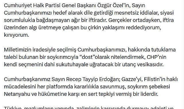 İLETİŞİM Başkanı Burhanettin Duran, "Milletimizin iradesiyle seçilmiş Cumhurbaşkanımızı, hakkında tutuklama talebi bulunan bir soykırımcıyla 'dost' olarak nitelendirmek, CHP'nin kendi seçmenini dahi sukutuhayale uğratacak bir utanç vesikasıdır" dedi.İletişim Başkanı Duran, sanal medya hesabından yaptığı açıklamada, "Cumhuriyet Halk Partisi Genel Başkanı Özgür Özel'in, Sayın Cumhurbaşkanımızı hedef alarak dile getirdiği mesnetsiz iddialar, siyasi sorumlulukla bağdaşmayan ağır bir iftiradır. Gerçekler ortadayken, iftira üzerinden algı üretmeye çalışan bu çirkin yaklaşımı reddediyorum, kınıyorum. Milletimizin iradesiyle seçilmiş Cumhurbaşkanımızı, hakkında tutuklama talebi bulunan bir soykırımcıyla 'dost' olarak nitelendirmek, CHP'nin kendi seçmenini dahi sukutuhayale uğratacak bir utanç vesikasıdır. Cumhurbaşkanımız Sayın Recep Tayyip Erdoğan; Gazze'yi, Filistin'in haklı mücadelesini her platformda kararlılıkla savunmuş, soykırım şebekesi Netanyahu ve hükümetine karşı en sert tepkiyi vermiş bir liderdir. Türkiye, mazlumların yanında, zalimlerin karşısında durmaya; adaleti ve hakkaniyeti savunmaya kararlılıkla devam edecektir" ifadelerini kullandı.