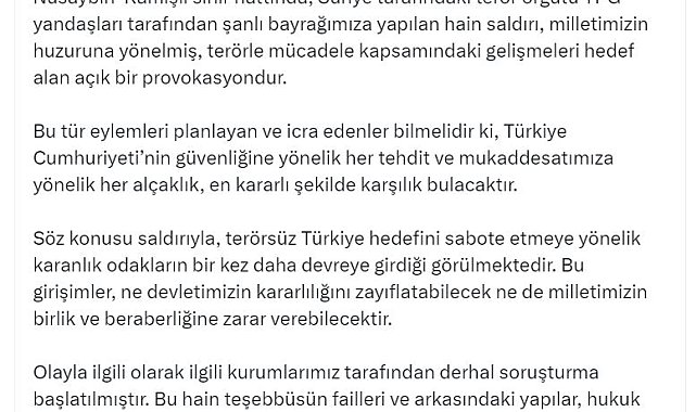 ANKARA, (DHA)- İLETİŞİM Başkanı Burhanettin Duran, "Nusaybin-Kamışlı sınır hattında, Suriye tarafındaki terör örgütü YPG yandaşları tarafından şanlı bayrağımıza yapılan hain saldırı, milletimizin huzuruna yönelmiş, terörle mücadele kapsamındaki gelişmeleri hedef alan açık bir provokasyondur