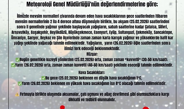 İSTANBUL Valiliği akşam saatlerinden itibaren kentte beklenen fırtınaya ilişkin uyarıda bulundu.İstanbul Valiliği'nin sanal medya hesabından yapılan açıklamada, "Meteoroloji Genel Müdürlüğü'nün değerlendirmelerine göre; İlimizde mevsim normalleri civarında devam eden hava sıcaklıklarının gece saatlerinden itibaren mevsim normallerinin 2 ila 4 derece altına düşmesiyle birlikte, bu akşam (25.02.2026) saatlerinden sonra il genelinde yağmur şeklinde başlayacak yağışların, sabah saatlerine kadar Çatalca, Silivri, Arnavutköy, Başakşehir, Beylikdüzü, Büyükçekmece, Esenyurt, Eyüp, Sultangazi, Çekmeköy, Sancaktepe, Ümraniye, Sarıyer, Beykoz ve Şile ilçelerinde zaman zaman karla karışık yağmur ve yükseklerde hafif kar yağışı şeklinde yağacağı tahmin edilmektedir. Yağışların, yarın (26.02.2026) öğle saatlerinden sonra ilimizi terk edeceği beklenmektedir. Rüzgar, bugün genellikle kuzeyli yönlerden (25.02.2026) orta, zaman zaman *kuvvetli* (30-50 km/saat); hava sıcaklıkları Bu gece (25.02.2026) beklenen en düşük hava sıcaklığının 1°C, Yarın (26.02.2026) beklenen en yüksek hava sıcaklığının ise 8°C olacağı tahmin edilmektedir. Fırtınayla birlikte ulaşımda aksamalar, çatı uçması ve ağaç devrilmesi gibi olumsuzluklara karşı dikkatli ve tedbirli olunmalıdır" ifadeleri kullanıldı.