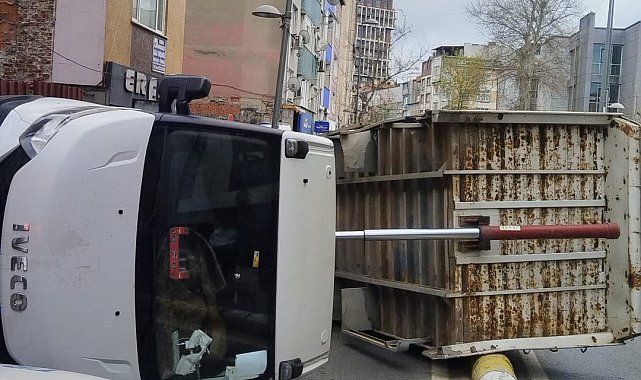 Kağıthane'de demir boşaltılan kamyon devrildi
