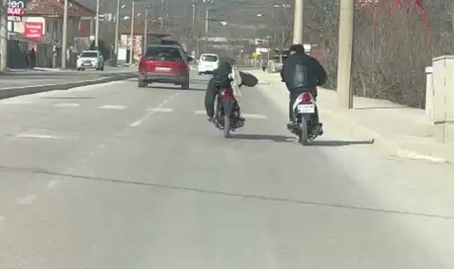 TOKAT'ın Erbaa ilçesinde plakasız motosikletin üzerine yüzüstü yatarak kullanan kasksız sürücünün tehlikeli yolculuğu, cep telefonu kamerasıyla görüntülendi. Olay, saat 14.30 sıralarında meydana geldi. Karayaka Bulvarı istikametinde yan yana iki motosikletten birinin sürücüsü, aracı üzerine yüzüstü yatarak kullandı. Plakası olmayan motosikleti kasksız süren sürücü, yoldan geçen diğer sürücüler tarafından cep telefonu kamerasıyla görüntülendi. Görüntülerde; yan yana ilerleyen 2 motosikletlinin kask kullanmadığı, plakasız motosikletin sürücüsünün de aracın üzerine yüzüstü yatarak seyrettiği görüldü.